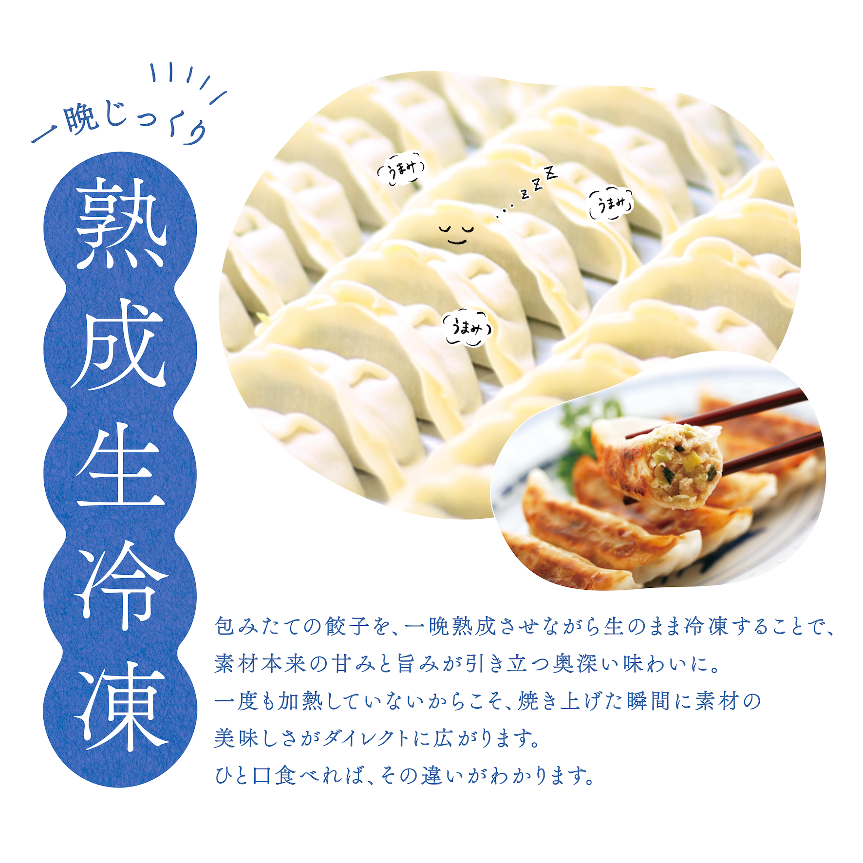 ⚫︎包みたての生餃子をすぐに冷凍し、ぎゅっと美味しさを閉じ込めました